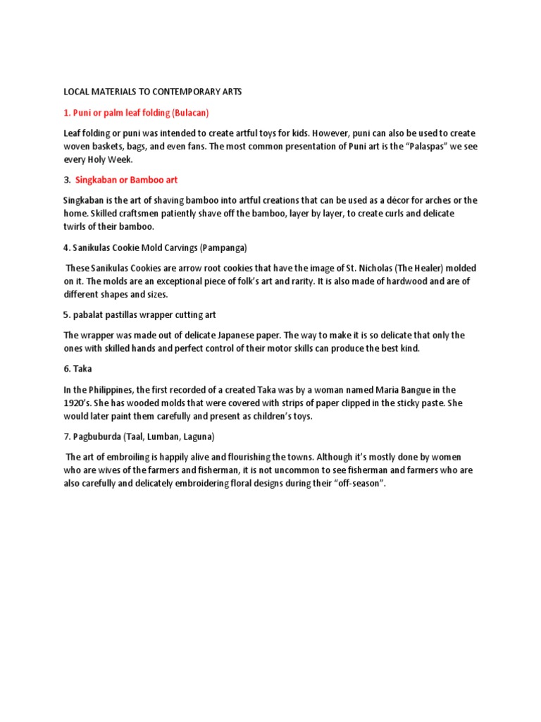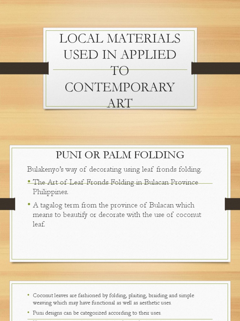 Local Materials used to contemporary artspptx. Singkaban Bamboo Art. The art of shaving bamboo into artful creations that can be used as decor for arches or the home. Puni art is the cretive way of decorating using coconut fronds. During the time of our late heroes the Puni is one of the most popular art in Bulacan. PUNI a tagalong term from the province of Bulacan which means to beautify or decorate with the use of coconut leaf. And Demonstrates the ways by which local materials and techniques can translate concepts and feelings about the local and the experiential through a studio visit and field work. Key to Introducing local materials.